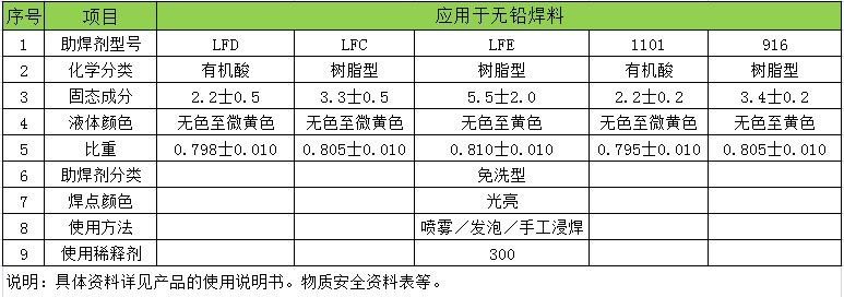 及ji時shi雨yu無wu鉛qian製zhi程cheng專zhuan用yong助zhu焊han劑ji係xi列lie產chan品pin,由you完wan全quan滿man足zu環huan保bao要yao求qiu的de精jing製zhi樹shu脂zhi及ji活huo性xing劑ji組zu成cheng,滿man足zu多duo種zhong無wu鉛qian製zhi程cheng精jing細xi複fu雜za的de技ji術shu要yao求qiu和he寬kuan範fan圍wei的de工gong藝yi窗chuang口kou。符fu合heMIL-14256/IPC -TM-650兩項標準,焊接可獲得良好的潤濕性能及飽滿的焊點,且具有極高的表麵絕緣電阻。